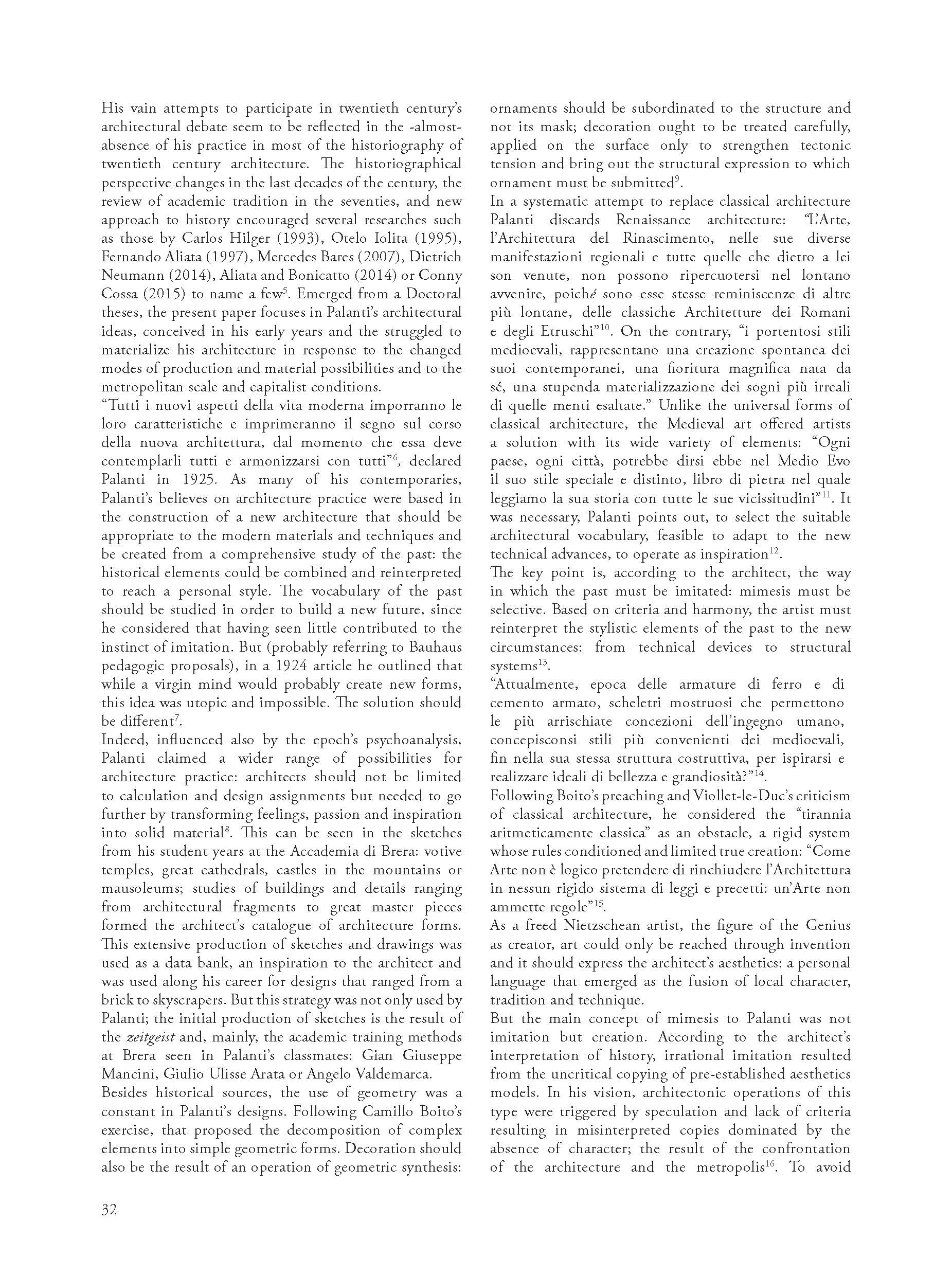 “L’Architettura è Scienza o è Arte?” Asked Milanese architect Mario Palanti in 1917. His question was not alone, as it is known, similar problems troubled architects of his generation: How to respond to the changed modes of production and material possibilities? How to integrate the values of history and the technology of the present? How to preserve values under capitalist conditions? Trained at Milano’s Accademia di Brera, Palanti’s trajectory alternates Italy and Latin America. His architecture, located in Buenos Aires and Montevideo, oscillates among conventional designs, utopian megastructures and the inventive use of new materials. His enthusiasm for new technologies ought to provide technical answers to the problems of the modern metropolis. By the analysis of his texts, buildings and designs, this work aims to give a perspective of the transition from an academic education in fin-de-siècle Italy to the solutions provided to the latin-american architecture problems of the turn of the century.